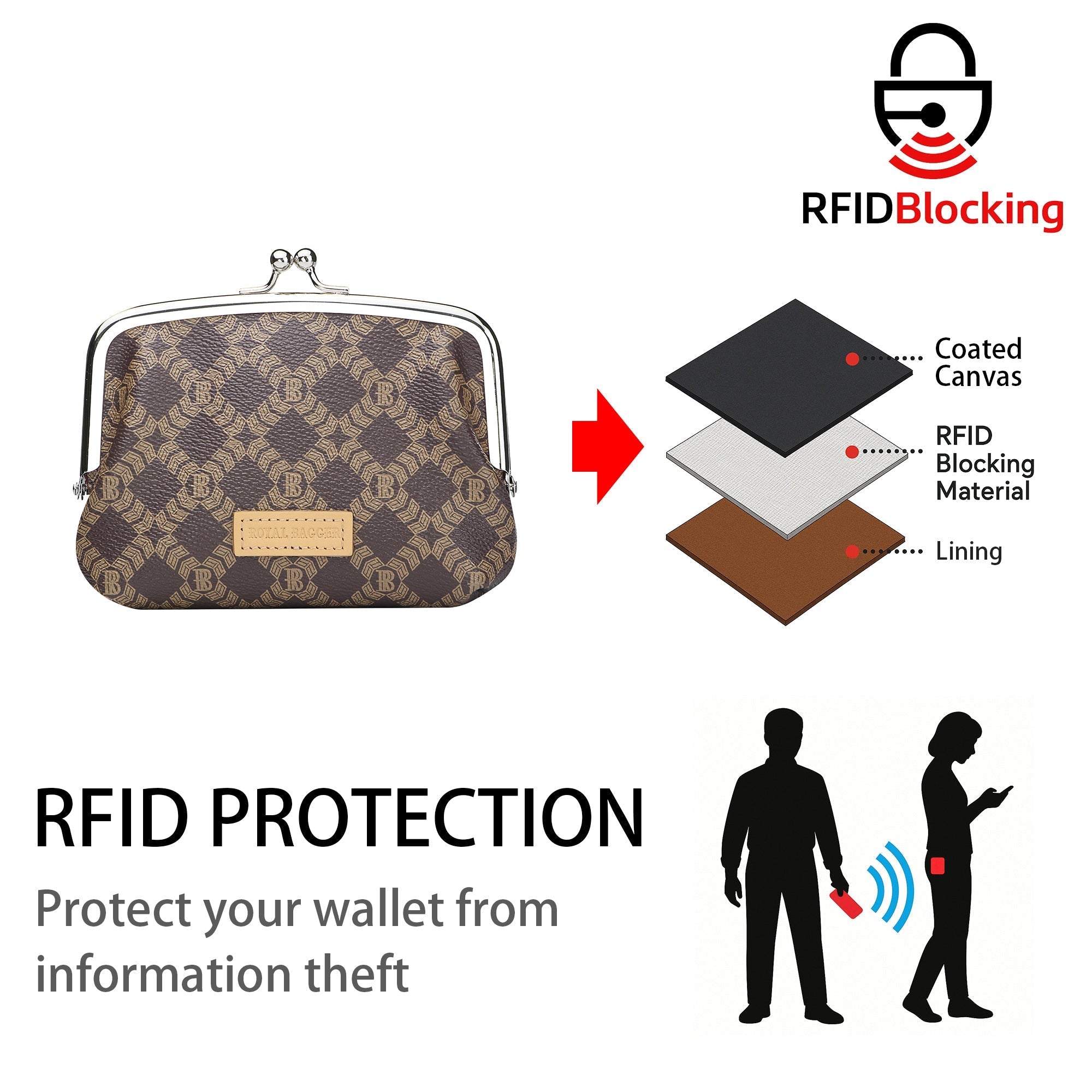 Royal Bagger RFID Coin Purses for Women, Fashion Kiss Lock Change Pouch, Double Clip Key Card Storage Bag, Signature Coated Canvas & Vegetable-Tanned Cowhide Leather 2858