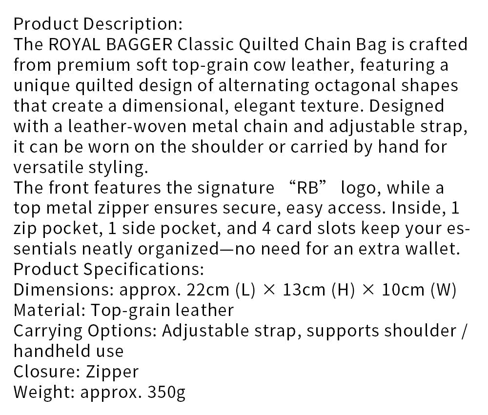 Royal Bagger Classic Quilted Chain Shoulder Bag for Women, Genuine Soft Cow Leather Underarm Purse, Fashion Handbag 3263