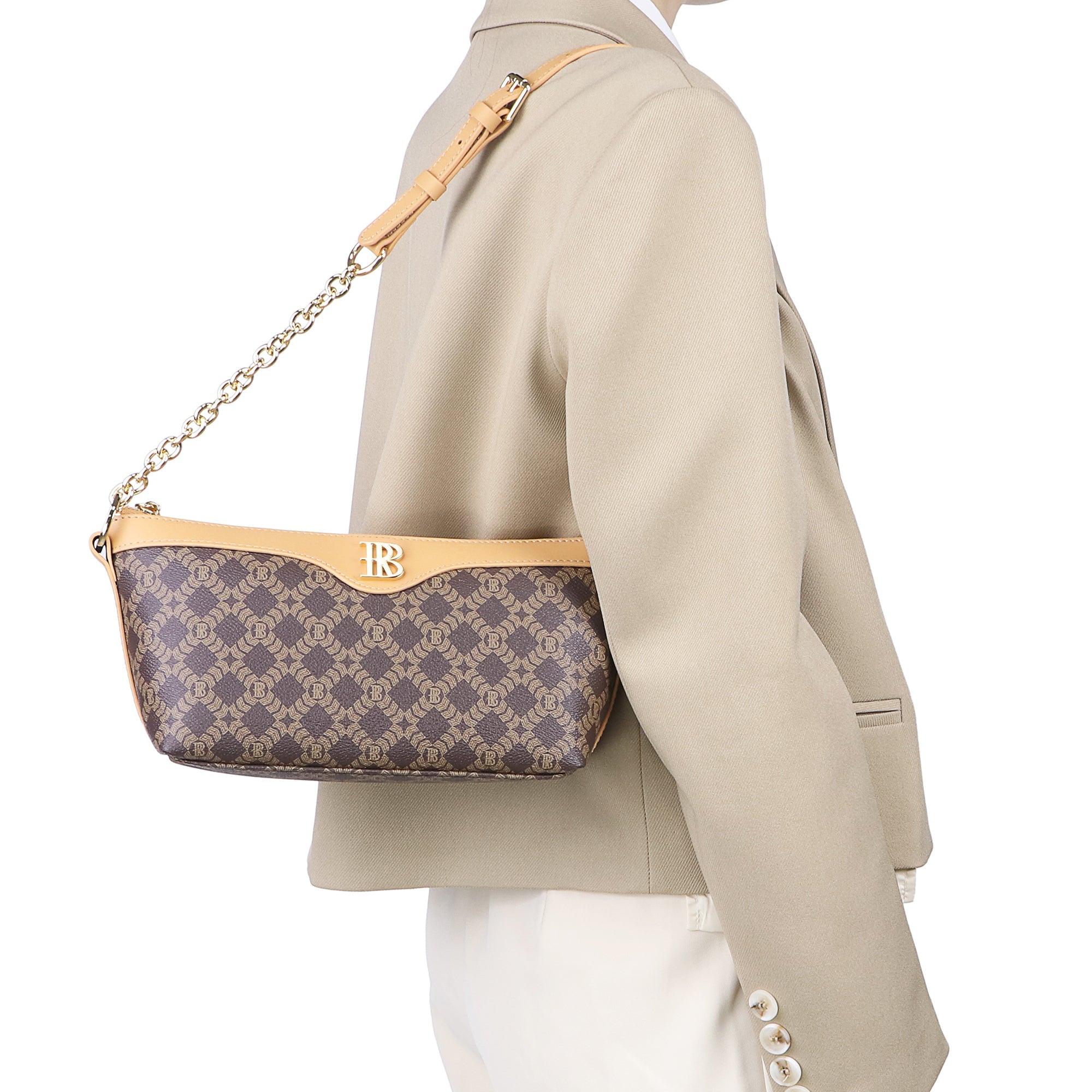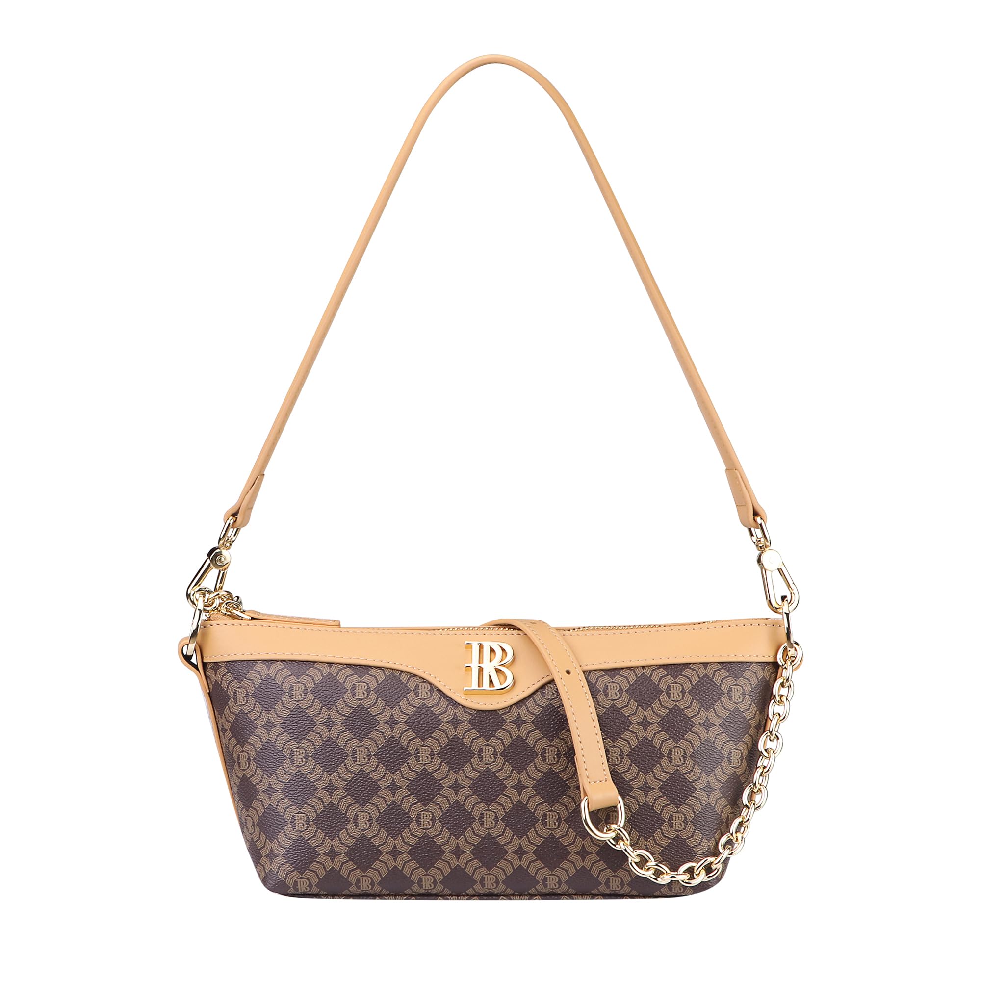 Designed with a leather-woven metal chain and an adjustable strap, it can be worn on the shoulder or carried by hand for versatile styling options. The front features the signature “RB” metal logo, adding a touch of brand elegance, while a smooth top zipper ensures your belongings stay secure.